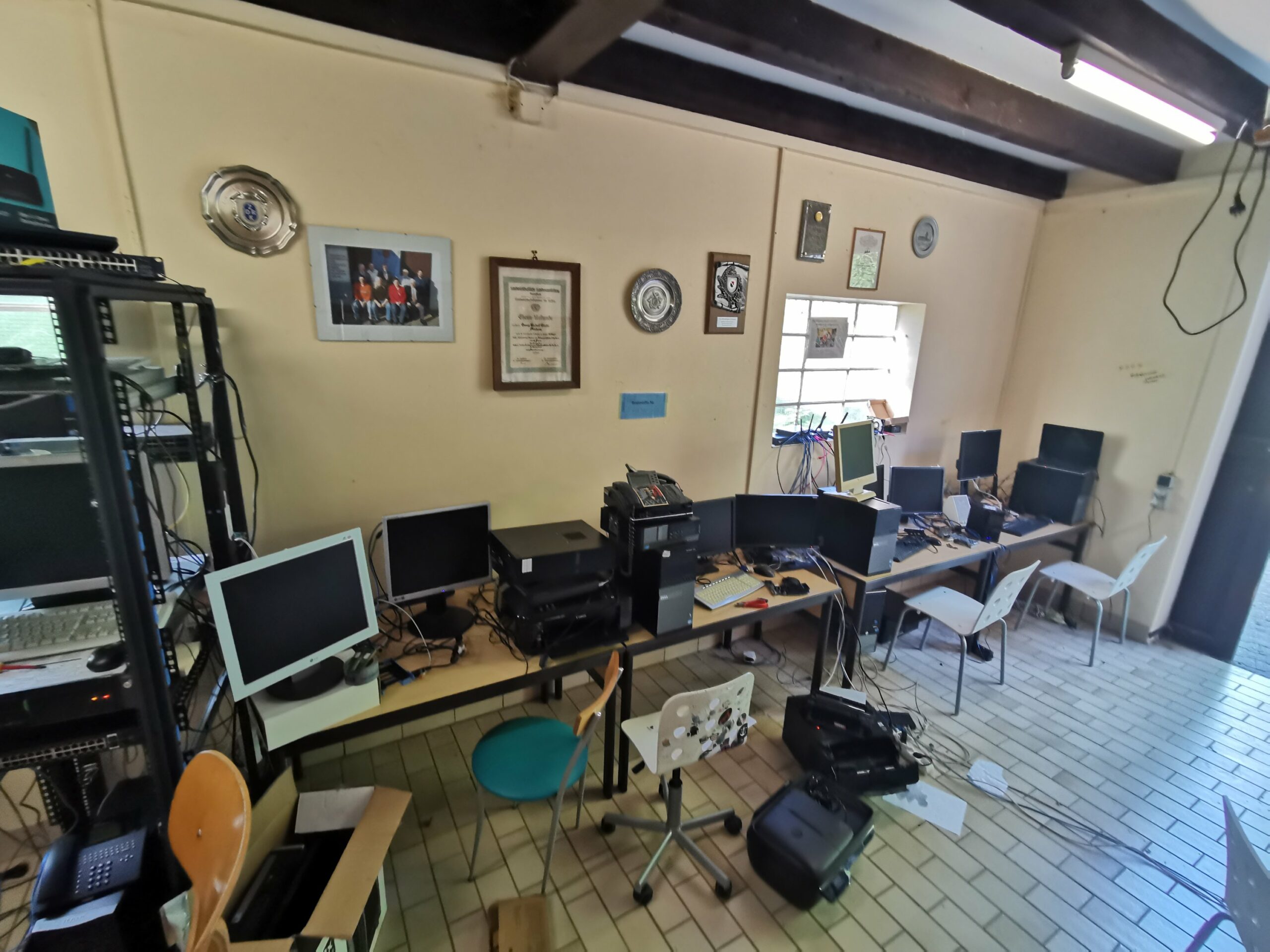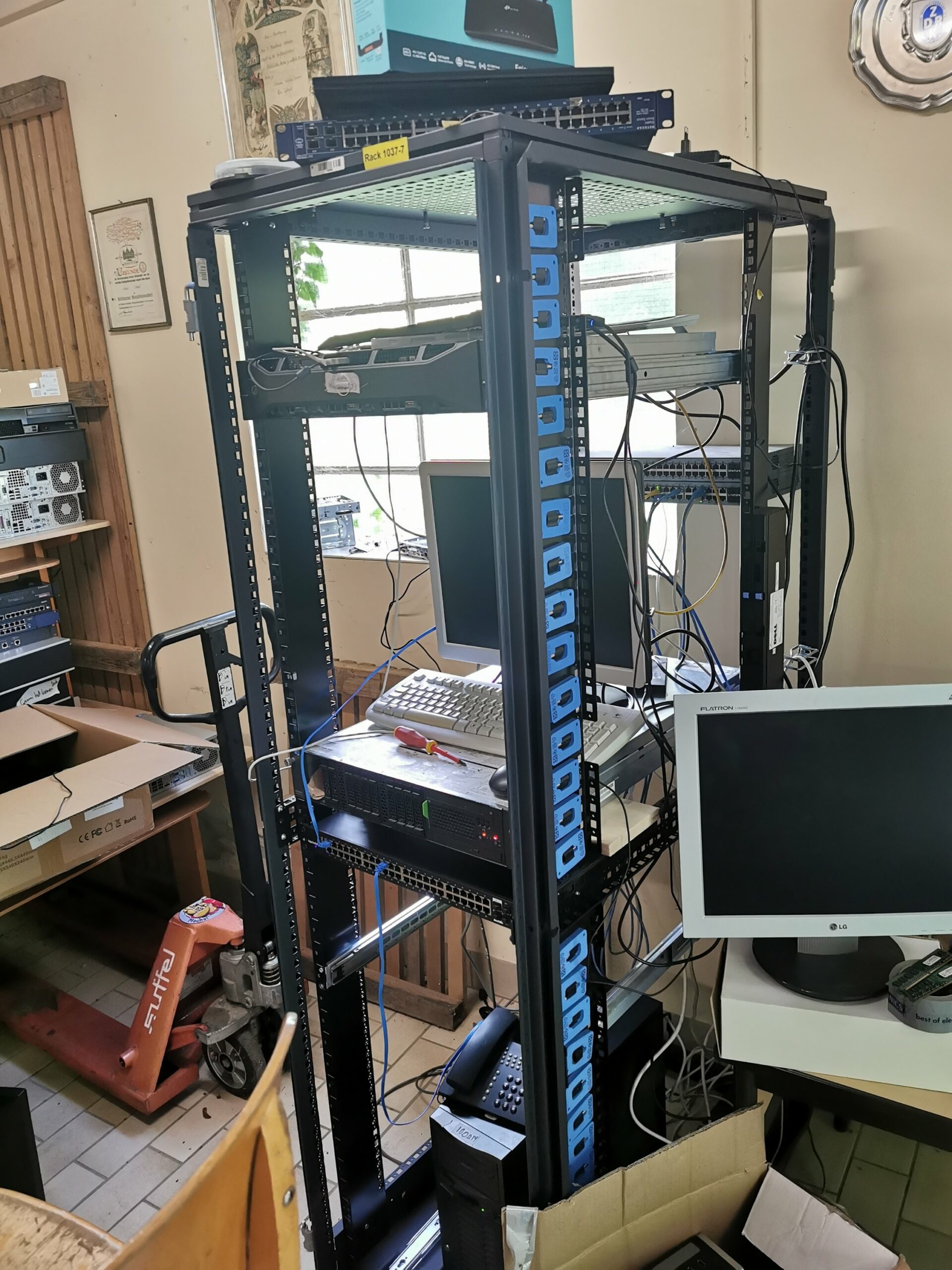 Die Scheune sieht mit dem Serverschrank und den Arbeitsplätzen wirklich schick aus. An der Bodenverkabelung arbeiten wir noch ….