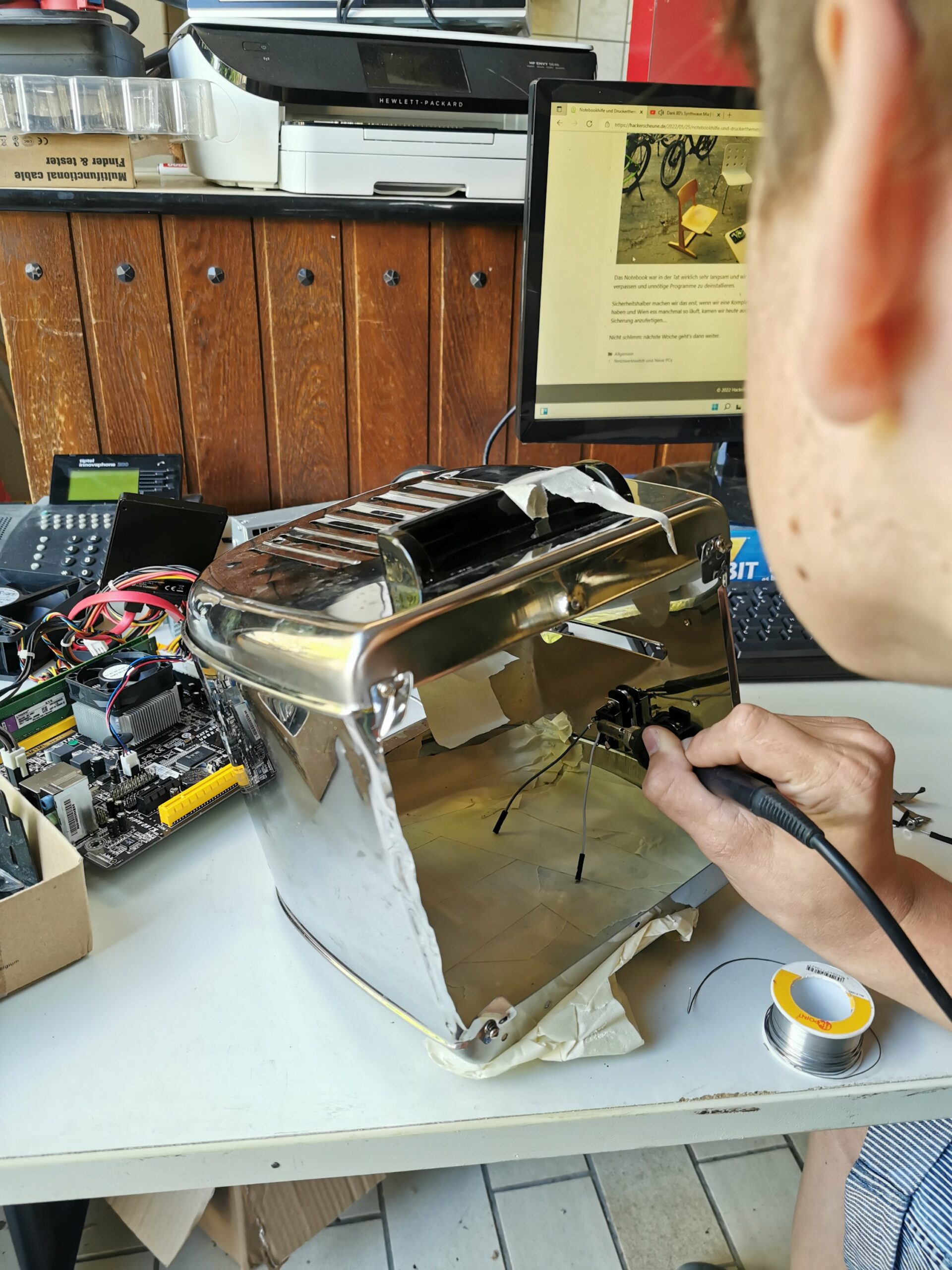 Heute haben wir wieder viel gemacht. Es wurde der Laptop von letzter Woche fertiggemacht und am Toaster-PC weitergebaut wurde. Genau genommen wurde ein Knopf zum Starten angelötet. Nach einigen Startschwierigkeiten hat es dann doch funktioniert.