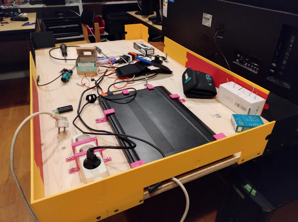 Die nächsten Gehäuseteile sind fertig gedruckt und wurden verbaut. Der Laptop hat eine Aussparung um an diesen heranzukommen. Die letzten 4 Gehäuseteile sind designt und im Druck. Jeweils mit Aussparung für kleine und auch große Flipperknöpfe. Vier Knöpfe für: